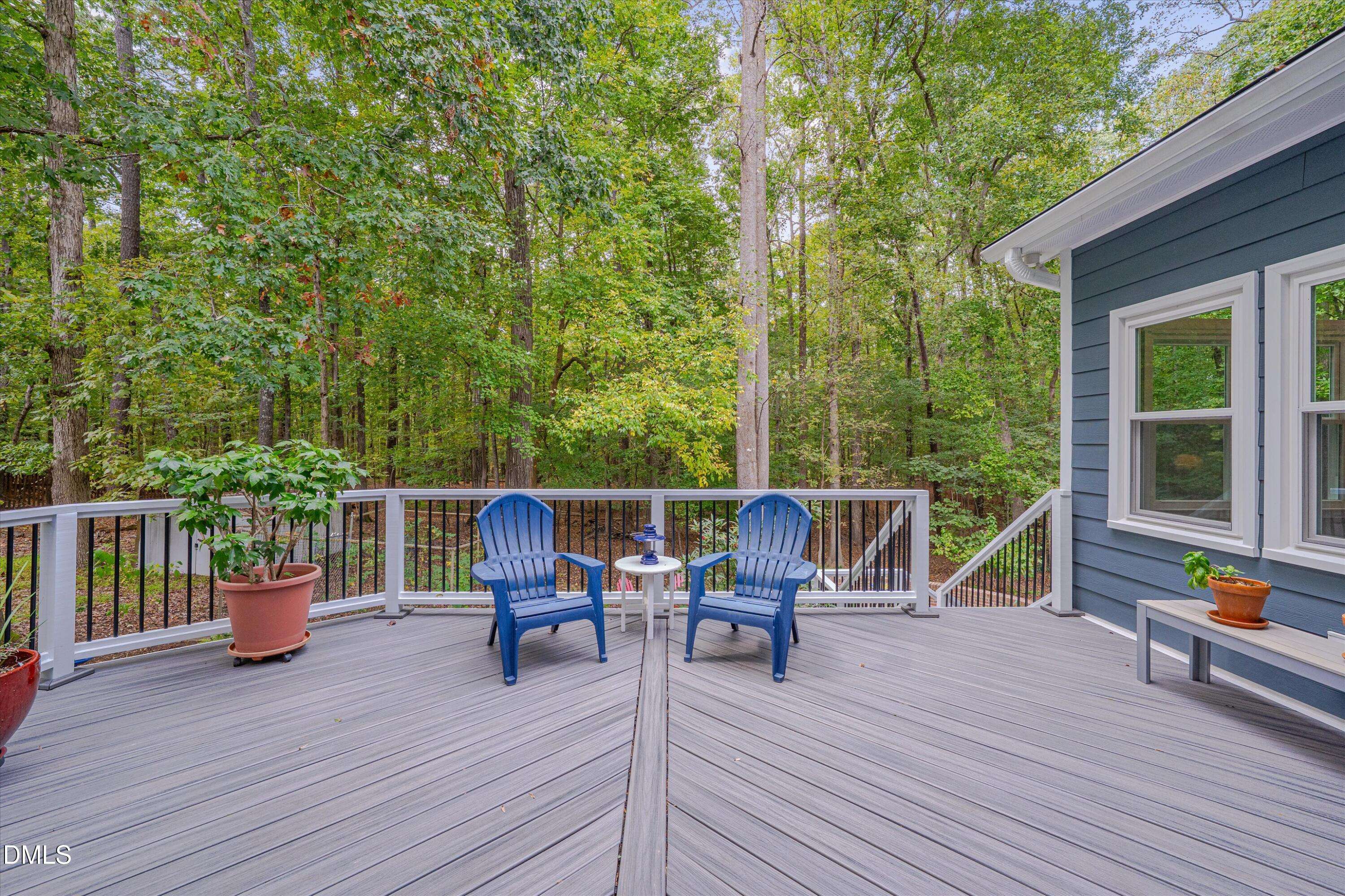 A nature lover's paradise, 205 Cates Farm offers a timeless floor plan, stellar upgrades, multiple flex spaces, and a very coveted location! Right away you will notice the lush yard and upgraded fiber cement siding at this Chapel Hill oasis. A landscaper's delight, native bushes and trees have been maintained and flourishing here for decades. Once inside, you are greeted with freshly refinished and thoughtfully stained hardwoods throughout most of the sprawling first floor as well as fresh paint from top to bottom. Upgraded, double hung, ProVia windows and external doors with lifetime warranty give this home the continued low-maintenance feel. In addition to the environmentally friendly widows and doors, you have two HVACs, one only 1 year old and the other only 5 years old. The formal living room is big and bright. The dining room is intimate and leads you to the large kitchen with loads of counter and cabinet space, a gas cooktop, Corian countertops, under cabinet lighting, updated appliances, a pretty bay window, 42'' cabinets, and a side entry door to the deck. The laundry room and garage entry are also at this end, keeping your indoor space tidy with easy mudroom access. A spacious sunroom overlooks all the back yard has to offer (which is lot - we will get to that in a minute). Next to your sunroom is your equally cheery family room. With vaulted ceilings, a wood-burning fireplace, and tons of natural light, this big space also happens to be very intimate. Rounding out the variety of great spaces on the first floor is a cozy office with French doors. Upstairs you will find brand new carpet and four generously sized bedrooms. Your primary bedroom suite is grand with French doors, a large walk in closet (with natural light from a window) and big, bright bathroom with tile floors. Three more bedrooms grace this floor - they all offer plentiful space and storage. The secondary bathroom has two sinks! A special surprise awaits in the 4th bedroom - a large walk in storage room with shelving for all of your storage needs. One of my favorite things about this lovely home is the back yard. Your choice of trail from the front: storybook pavers or a mulch path, the serene views cannot be denied. Your back deck is Trex decking - giving you freedom from the maintenance of traditional wood. Also, the there is a gas line that can be hooked up to your grill for a constant supply of cooking fuel! As if the deck space wasn't enough, you have an expansive lower patio overlooking the tranquil forest to the west. 205 Cates Farm has everything you have been looking for in your next home and less than 2 miles from the heart of downtown Carrboro - with sidewalks leading the way. Did I mention the neighborhood school is right across the street from this beloved neighborhood? Take a tour of this move-in ready gem today!